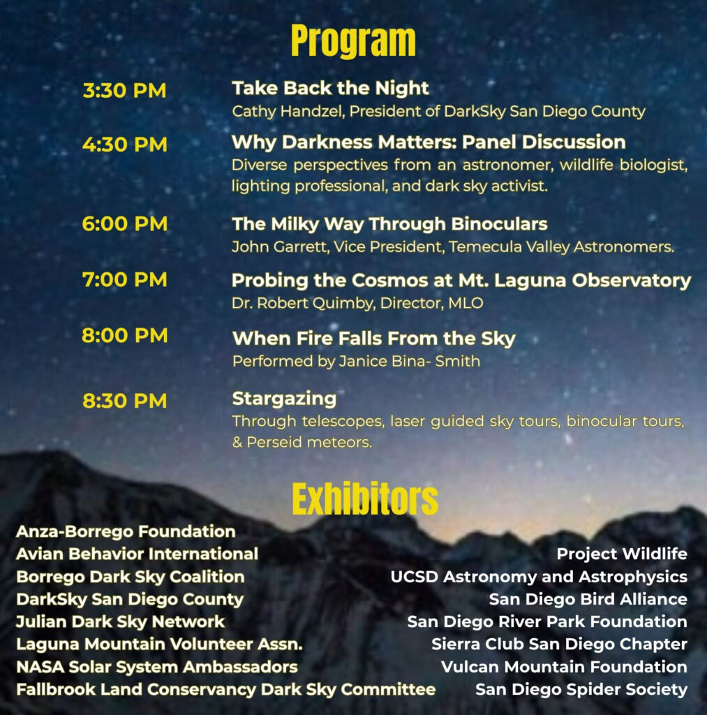 Across San Diego County, a growing dark sky movement is taking shape. Julian and Borrego Springs have already earned recognition as International Dark Sky Communities by DarkSky International. Fallbrook is now on the path to join them, and the Mission Trails Regional Park Foundation is working to achieve California’s first Urban Night Sky Place designation. An International Dark Sky Park application is also underway for the Laguna Mountain Recreation Area, which would join Anza-Borrego Desert State Park in holding this prestigious title. This festival celebrates our region’s shared commitment to protecting the night sky—and everything it touches. In an age when darkness is increasingly rare, this is your chance to experience it, fully and freely.